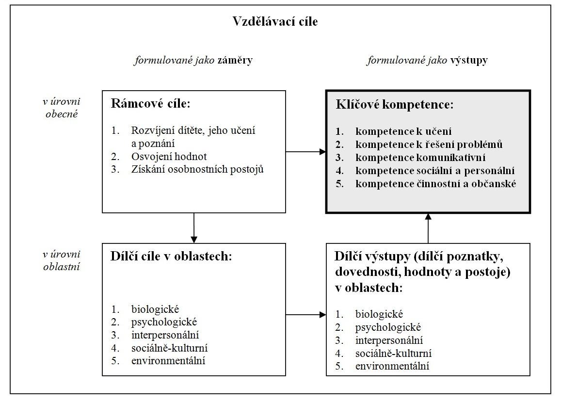 Legenda: Obecné záměry vzdělávání jsou vyjádřeny pomocí rámcových cílů, výstupy pak v podobě klíčových kompetencí. Rámcové cíle se promítají do pěti vzdělávacích oblastí a získávají podobu cílů dílčích. Jejich průběžné naplňování směřuje k dosahování dílčích kompetencí, které jsou základem pro postupné budování kompetencí klíčových.