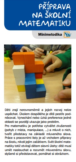 Příprava na školní matematiku V roce vznikly tři minimetodiky, z nichž jedna se zaměřovala na rozvoj matematické gramotnosti dětí předškolního věku. Ke stažení zde. |